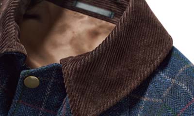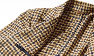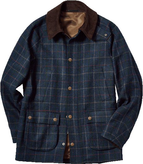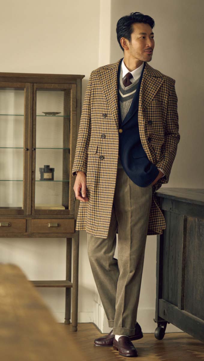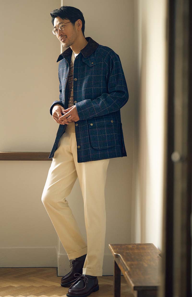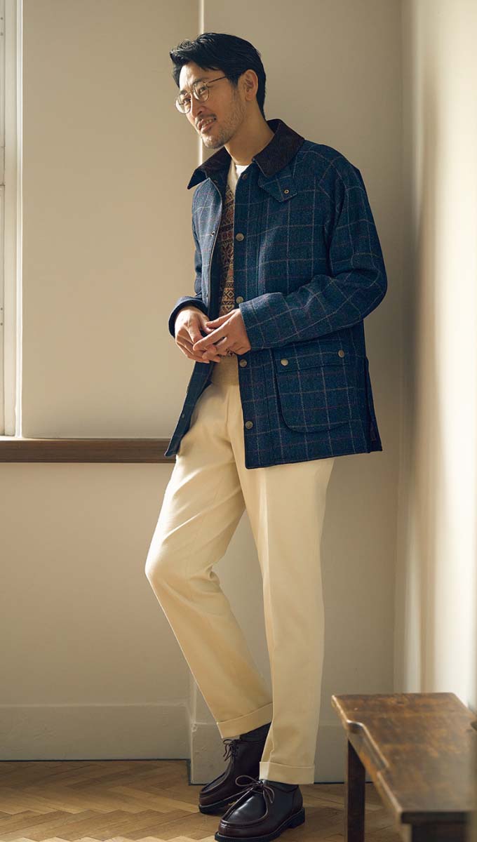 カジュアルなフィールドコートは、上質ツイード素材で差別化を。こちらは ディ・プレイ社のタータンチェック生地を用いた一着。スーツを着用することも想定した、裏地付きドレス仕様だ。8万8000円〈オーダー価格〉。