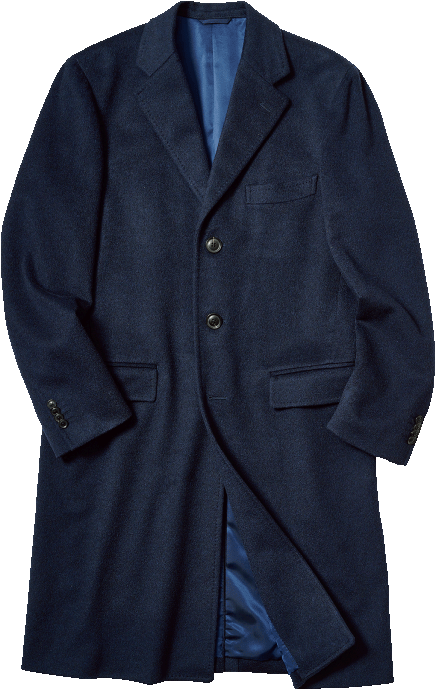 畏まったシーンにも対応するチェスターフィールドコートは、最初のオーダーコートにもおすすめ。ピアチェンツァ社のカシミア生地を使用したこちらは、高級感が段違い。末永く付き合える。13万5850円〈オーダー価格〉。