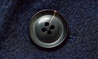 オプションで本水牛ボタンをチョイス。水牛の角を削って作られるこのボタンは、高級コートに欠かせない定番ディテール。重厚な艶が、コートの格を高めてくれる。