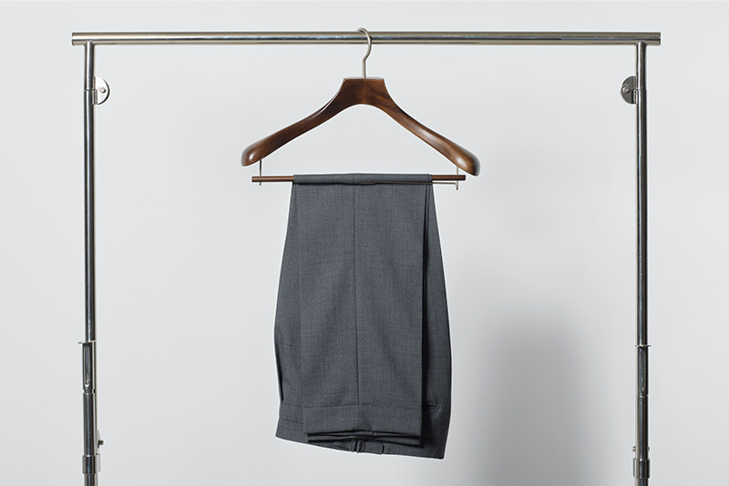 スラックスは脱いだ後は、すぐにハンガーにかけて休ませます。ベルトを外して、ポケットの中に入っているモノもあれば、すべて取り出します。脱いでそのままにしておくとシワになるのはもちろん、湿気がこもり生地に負担をかけることになります。スラックス専用の吊るすタイプのハンガーを使用し保管するのが理想です。折り目を揃えて、裾を上にして専用ハンガーに吊るせば、その重みでシワを取る効果も期待できます。ズボンはなるべく、連続の着用はせず、2日~3日休ませることが、長持ちの秘訣です。