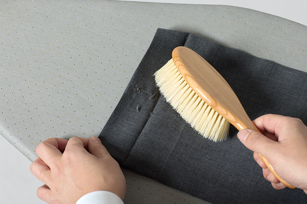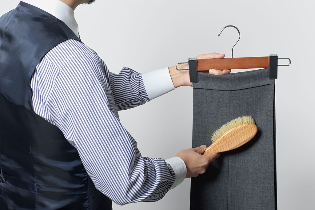 スラックスは、汚れていないように見えても、見た目以上にホコリや汚れがついています。これらを放っておくと、繊維の隙間に詰まり、生地の傷みや虫食いの原因になります。着用後にブラシを使ってホコリや汚れをしっかり落とすことが、スラックスを美しく保ち、長持ちさせるコツでもあります。ブラシは逆目でかき出し、そのあと順目で仕上げるのがコツです。