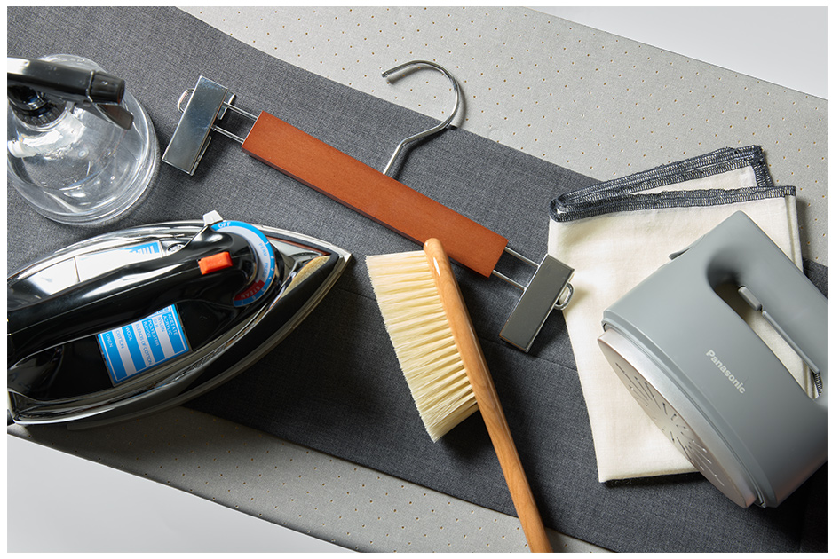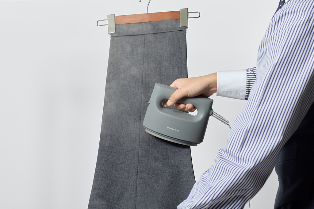スラックスのシワはつきものです。シワ取りは、基本的にスチームあてることで、湿気を与えて乾燥すれば、繊維の復元力でシワはキレイに伸びます。蒸気には消臭効果もあるので、清潔に保てます。デイリーに使用するのであれば、ハンディースチーマーやスチーム機能が付いているアイロンが便利です