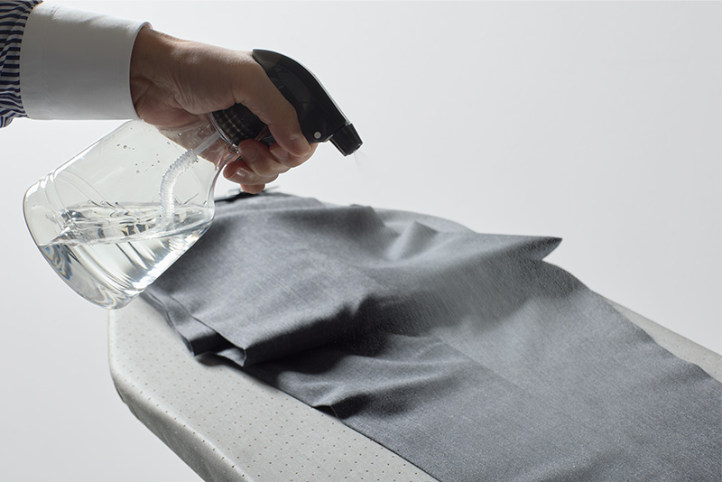 霧吹きをかける時は、シワが付いているところを中心に霧吹きを吹きかけます。特にヒザなどの関節の部分はよく動かすため、シワもできやすい箇所なので入念に吹きかけます。