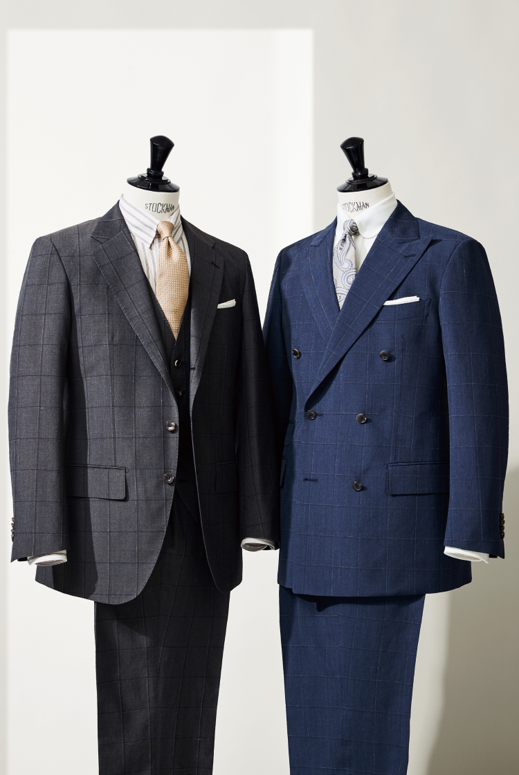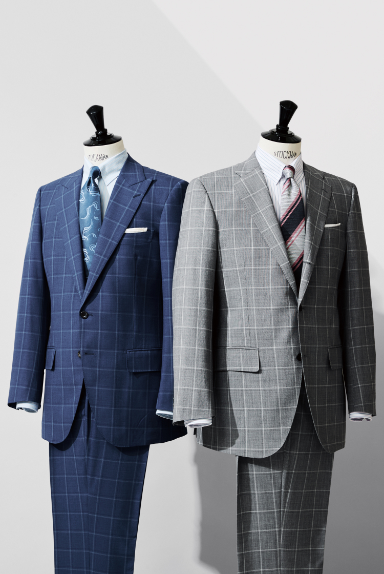 そんなある種、貴族趣味的な繊細な生地を、日常的なビジネスシーンで着用できるようにアレンジしたのが、今回の別注。糸の打ち込み本数をあえて増やして目付250gとしたことで、通気性や美しいドレープ感はそのまま、耐久性がアップし、より立体的なシルエットも楽しめる生地となりました。バリエーションは、ジャケット単体でも使いやすいよう、ネイビーとグレーのウィンドウペーンを2種類ご用意。ともに柄をイチから起こしたオルタネイトのウィンドウペーンとなっており、クラシックでありながら爽やかな印象を築けます。