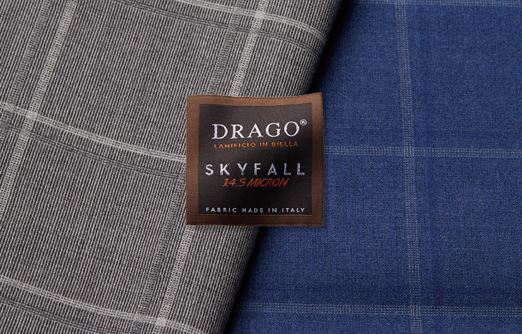 ドラゴは、スーパー130'S以上の極細原毛を使用した高級生地しか手がけていないことで有名ですが、中でもスカイフォールは、カシミヤに匹敵するほど細いスーパー180'S原毛を用い、そこにシルクをブレンドしたラグジュアリーな平織り生地です。抜群の通気性を備えながらしなやかで、リッチな光沢や、目付250gと非常に軽量なことから世界中のVIPに寵愛されています。