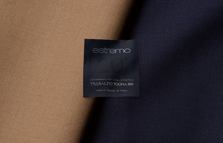 ベースとしたのは同社の「エストリーモ」コレクション。ウール100%の布帛ながら、高いストレッチ性能を実現した生地です。ウール本来のクリンプ(ちぢれ)を活用するため、約幅180cmで織った生地を独自の加工技術で150cmに縮め、抜群の伸縮性を与えているようです。