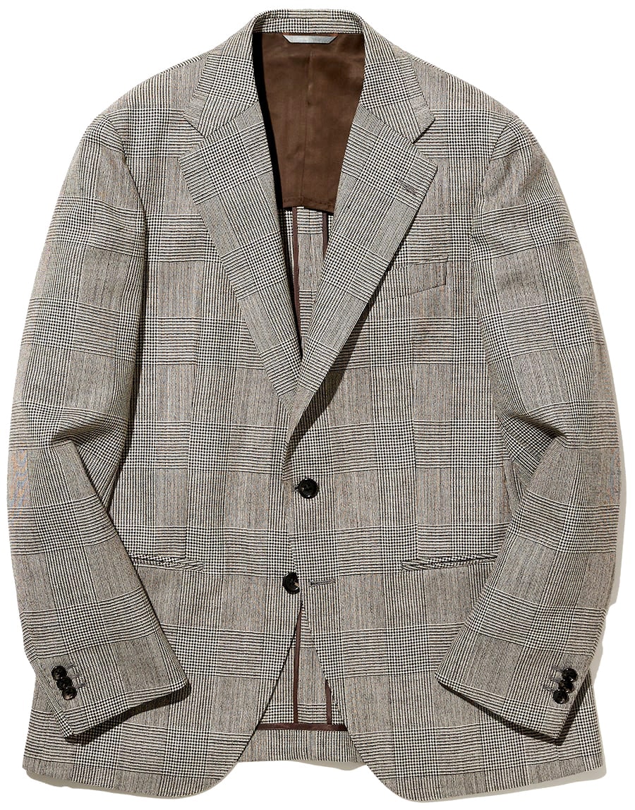低めのゴージライン、ワイドなラペルが特徴の「コンチネンタル」モデルを使用したオーダージャケット。四方さんは英国を意識しながらも、ソフトで軽やかな着心地を実現したいという考えから、生地には独特のハリコシを備える「MARLING&EVANS」のベージュグレンチェックを採用。その一方、肩パッドや芯地など副資材を省いたアンコン仕立てを用い、軽やかさを実現。さりげなくフラップ無しとなっている腰ポケットなど、ドレスマンの矜持を感じる1着だ。