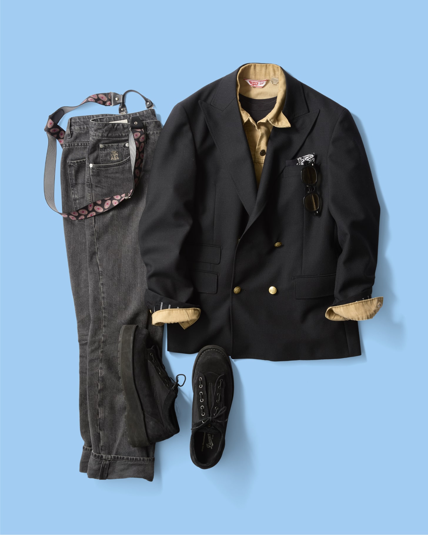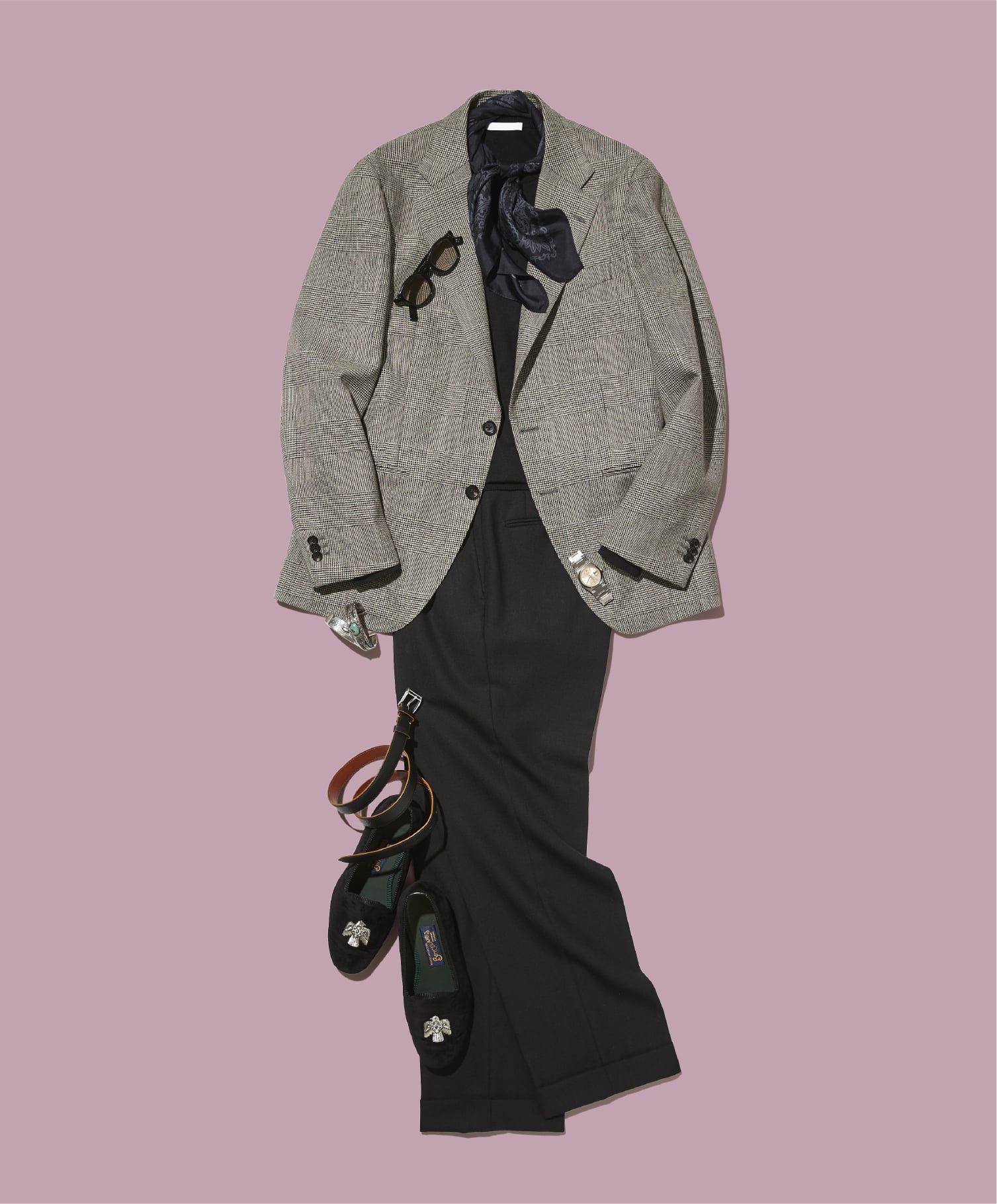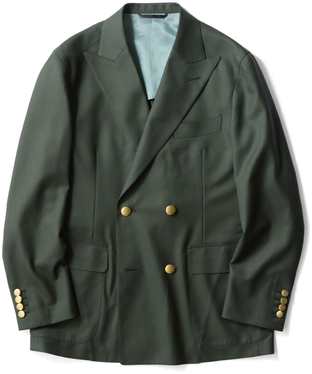 艶やかなミリタリーグリーンが目を引く1着は、吉野さんらしいこだわりの意匠がふんだんに盛り込まれた1着。素材感ある生地が選ばれやすいブレザーだが、「FRATELLI TALLIA DI DELFINO」の上質でクリアな生地に載せ替えることでドレスルックを強調。パッチ&フラップに主張ある金メタルボタン、繊細な色味の裏地など、独自のセンスで全てを調和させたジャケットは、言葉通り”パーソナル”を体現する。