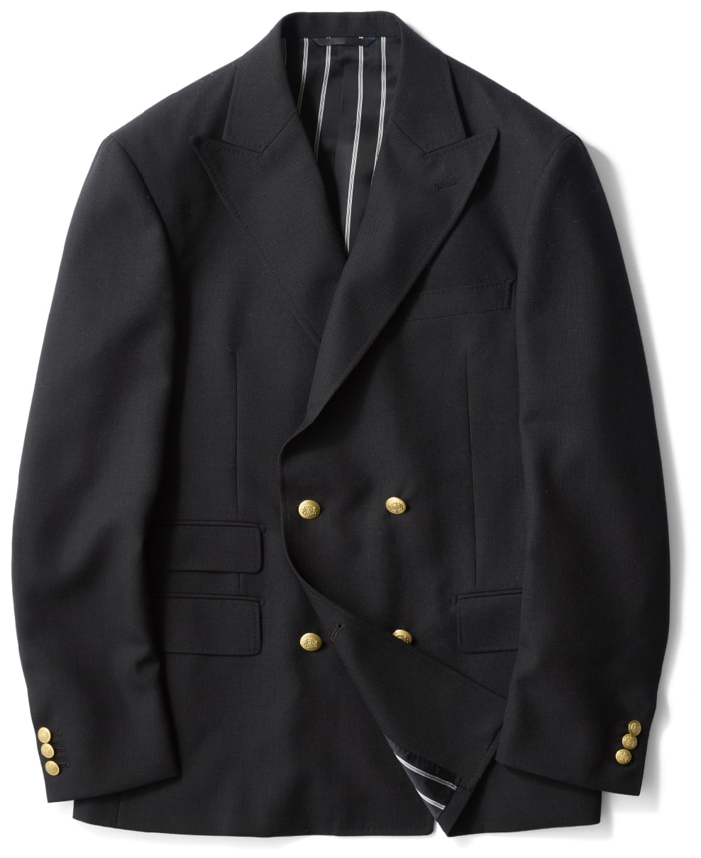 ストイックの中に遊び心佇む「ブラックWブレザー」。6ボタンよりもフランクに着用できるフロント4ボタンであるものの、ナチュラルショルダーと言われる肩周りに若干の主張がある袖付や腰のチェンジポケットなど、英国的要素が詰め込まれた1着。