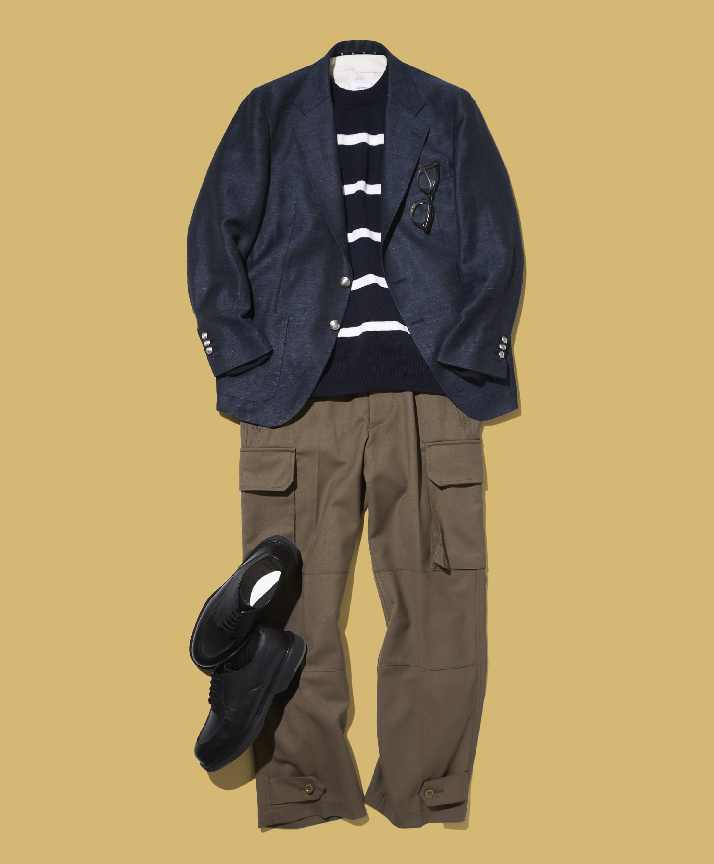 フレンチの基本であるボーダー柄のカットソーに、M47風のカーゴパンツをコーディネート。ミリタリーをルーツとするアイテムも、ジャケット同様に上質な素材を意識すると、大人のドレススタイルに。