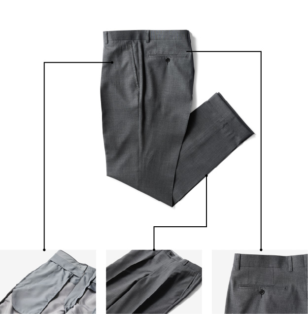 膝当ては、ウォッシャブルでありながら、放湿性と通気性に優れた贅沢なキュプラ/ポリエステル素材を採用しています。特殊な組織で、水抜けを向上させ、収縮を抑え、洗濯・乾燥シワの発生を低減させます。生地によって使い分けながら、洗濯後のプリーツセット性を高めるセット加工で、クリースを消えにくくしています。