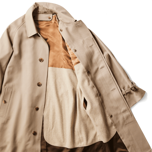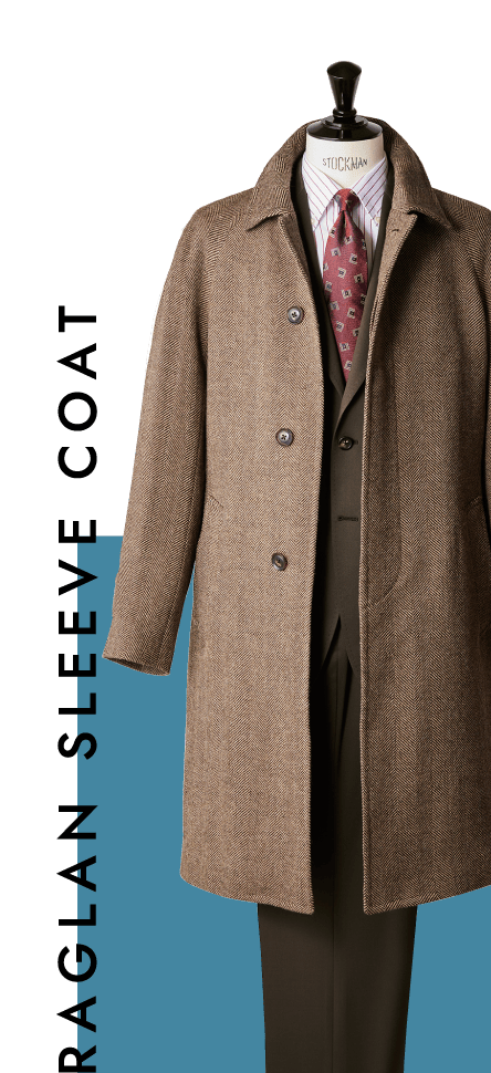 肩と袖が一体の丸みをおびた袖付けで、主にバルマカーンコートに採用されています。クリミア戦争で英国ラグラン将軍が手を負傷した際に着脱しやすいようにしたのが起源にあり、セットインスリーブよりもリラックス感あるのが特徴です。スーツには間違いないコートですが、ニットを合わせたコーディネートもおすすめです。