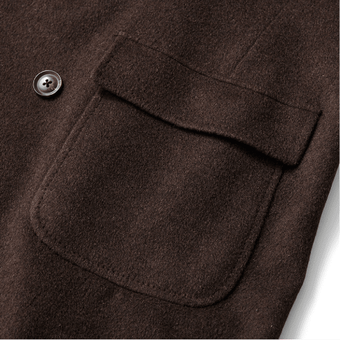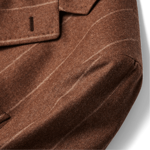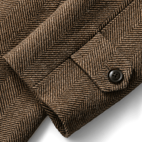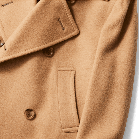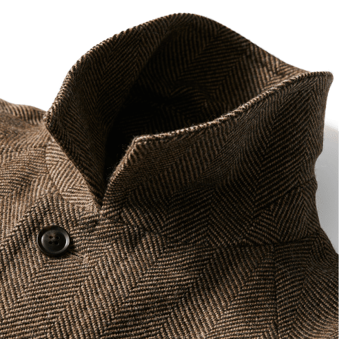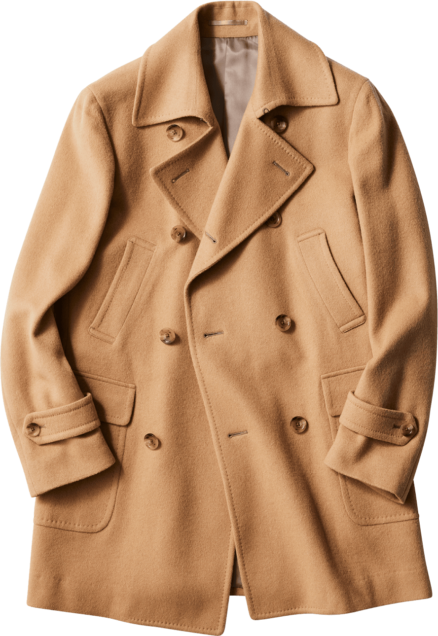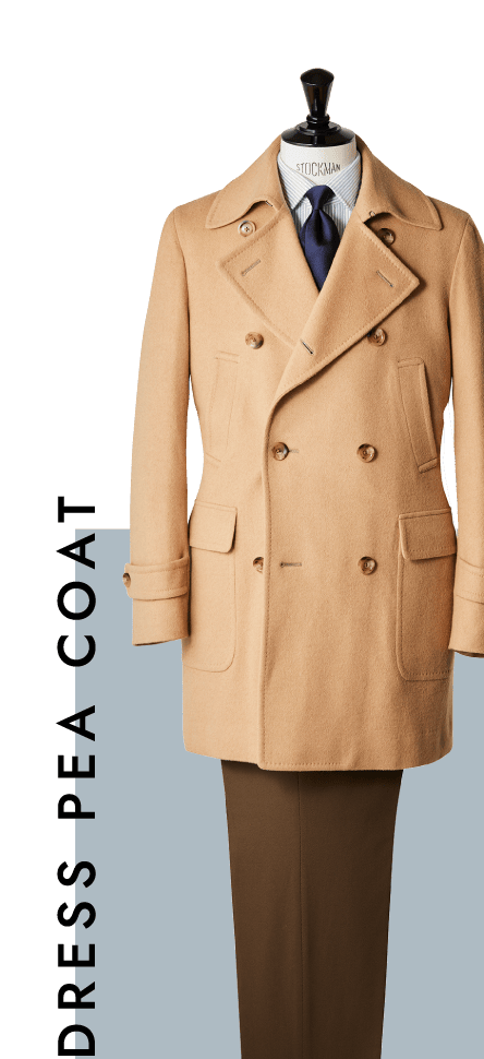 イギリス海軍が、船の甲板で作業する際に着用された作業着がルーツにあり、風向きによって左前と右前をフロントボタンの留め方で変えられるように作られています。麻布テーラーはクラシックな釦仕様、着丈を長く取り、シャープなシェイプラインを形成する事により、ドレッシーなピーコートにアレンジしました。